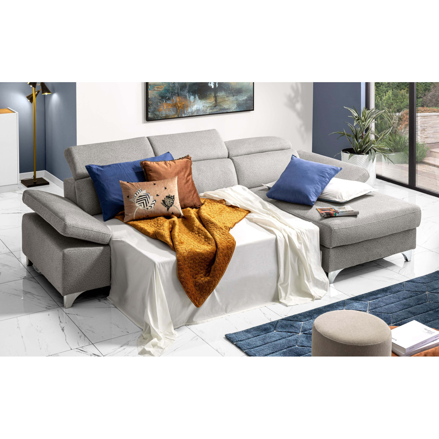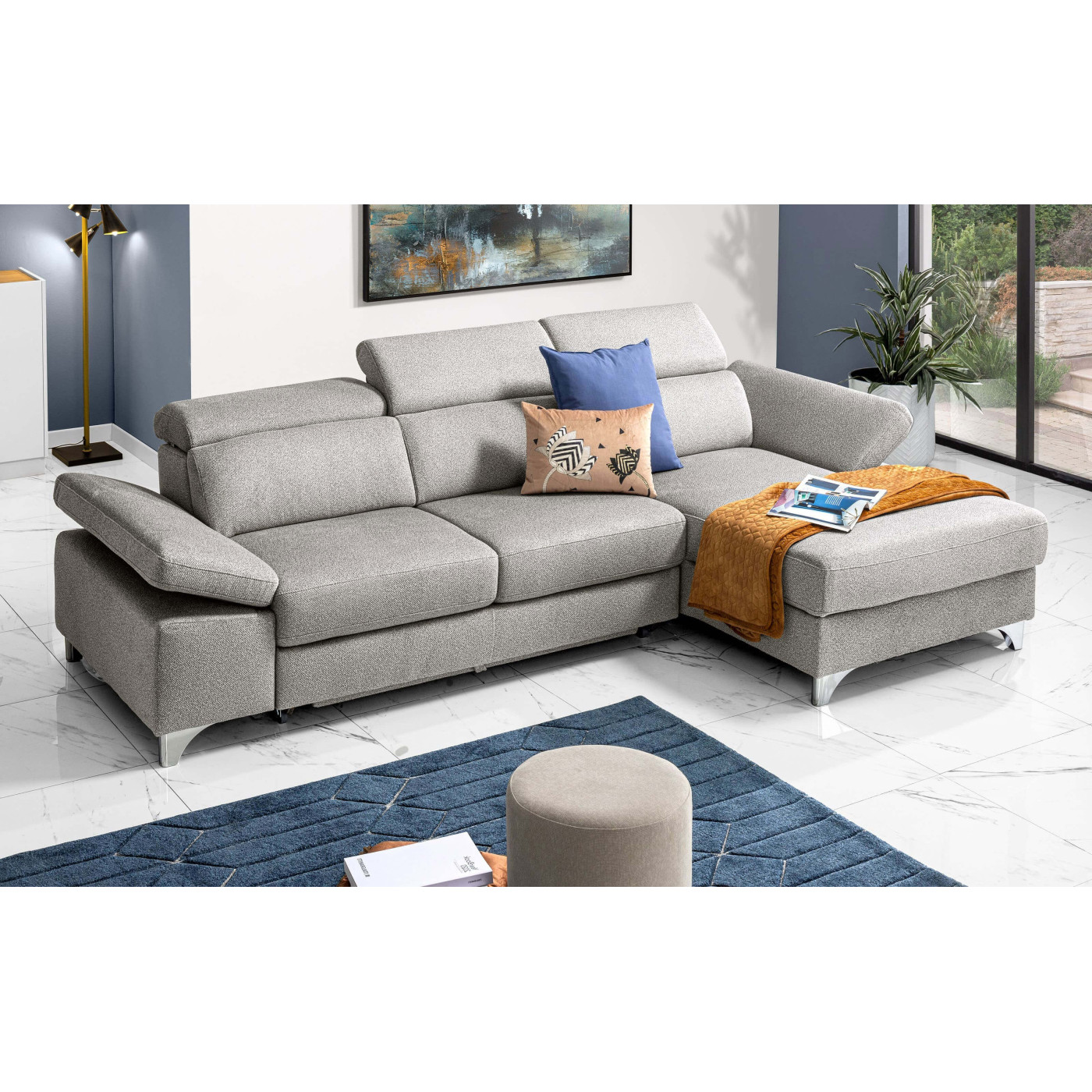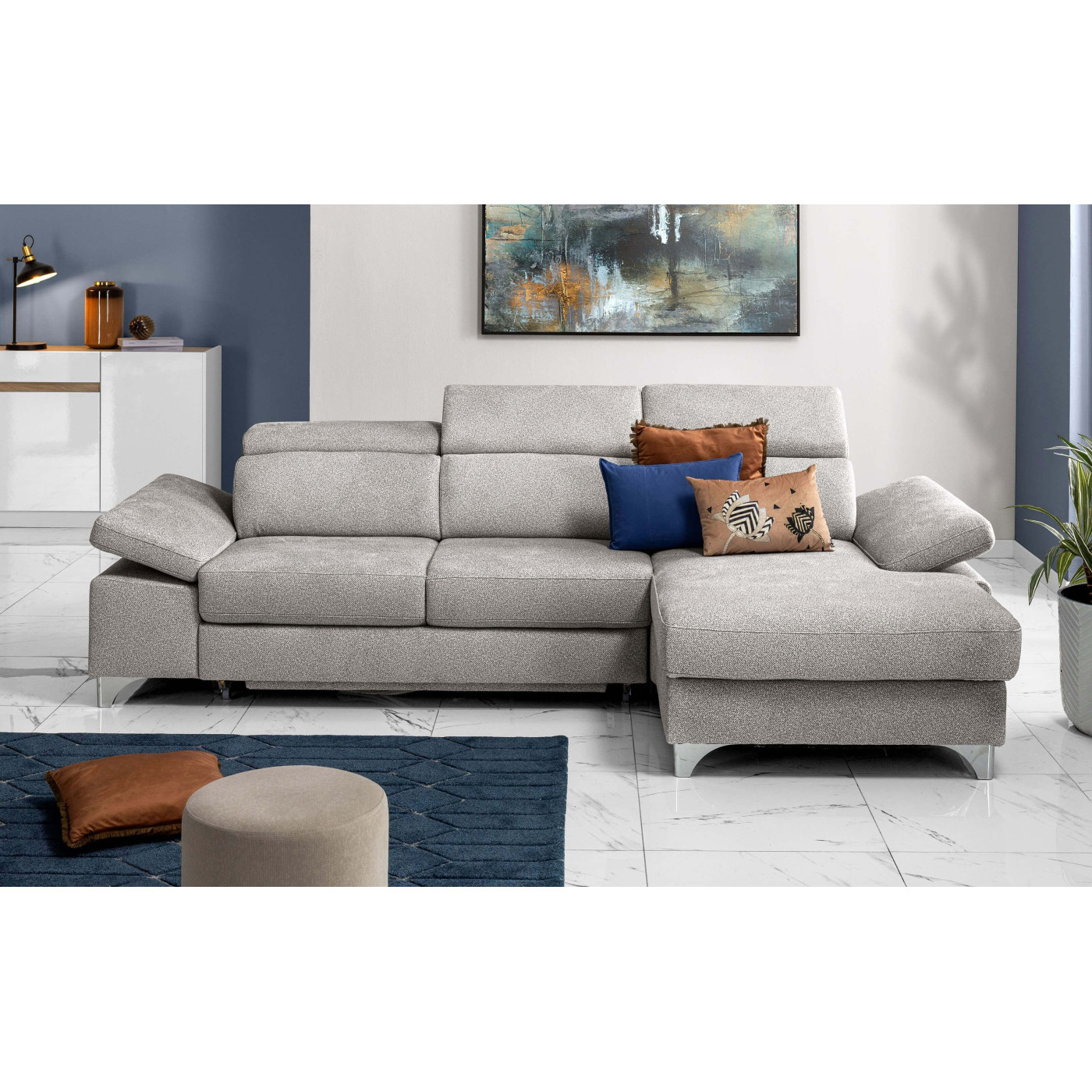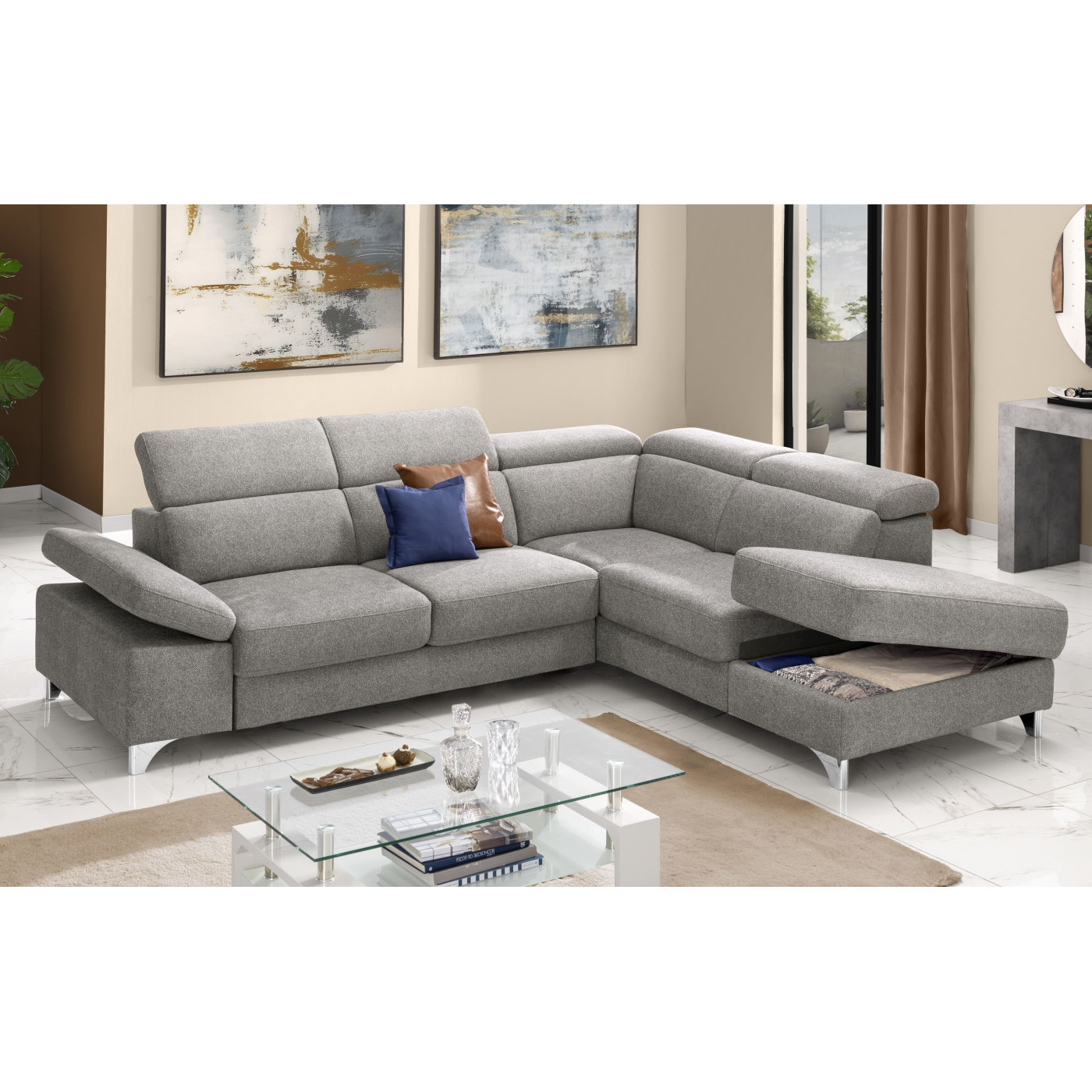 Sfrutta la praticità dei poggiatesta regolabili per goderti questo divano angolare in tutte le sue modalità, mentre grazie al pouf terminale con vano contenitore potrai tenere il soggiorno sempre in ordine!