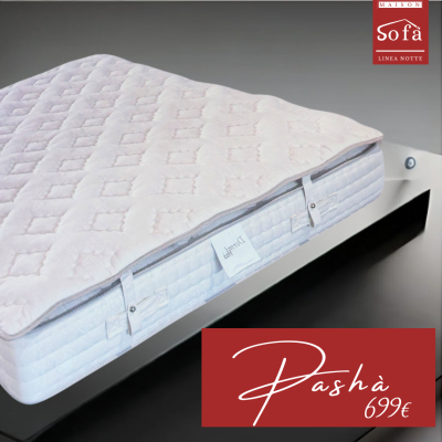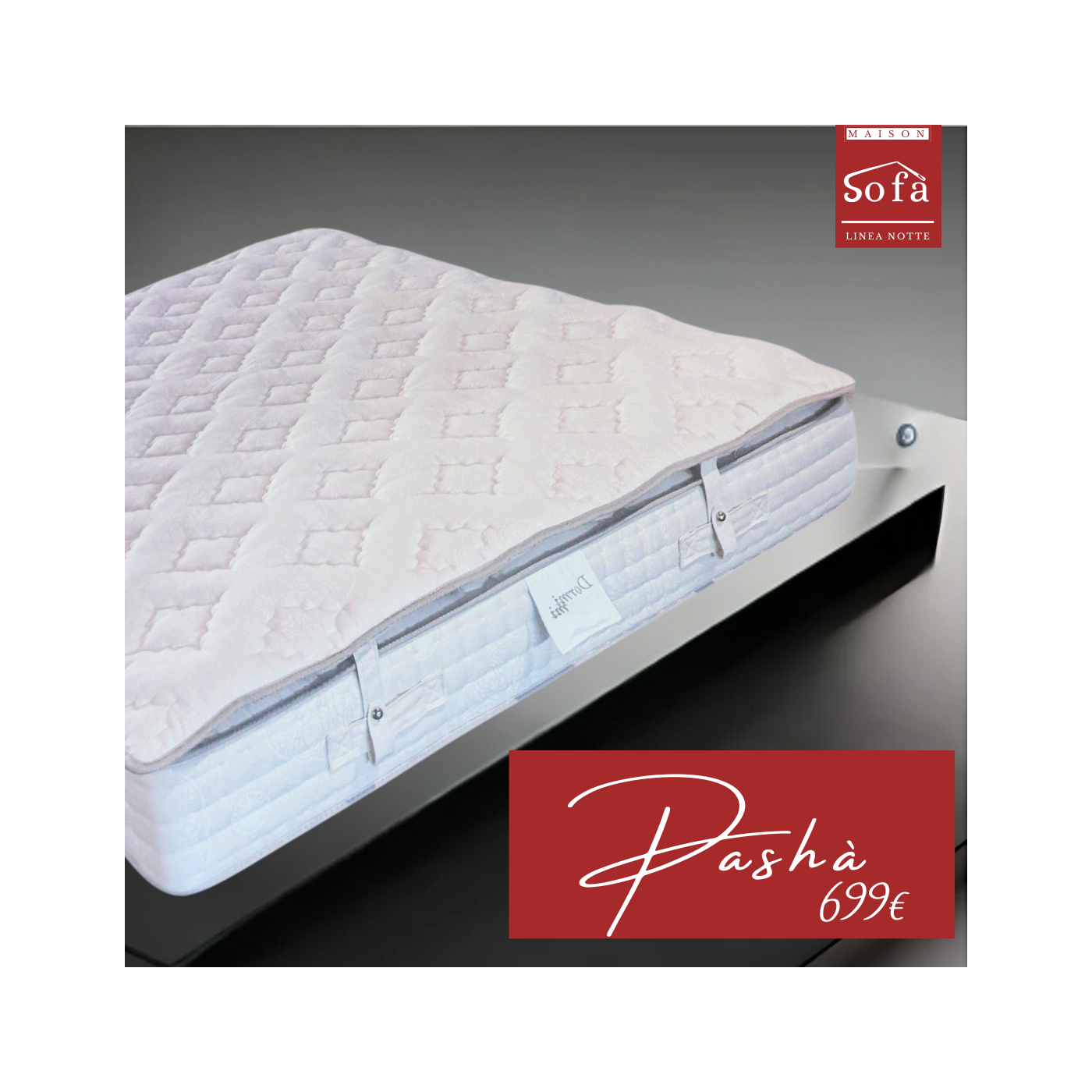 PASHÀ è un particolare materasso realizzato con pregiato lino di Flandra 100% naturale. Gode di un sistema di molle biconiche, denominate sistema Bonnel da cui prende nome, combinato con 3 cm di memory foam e impreziosito da un topper sganciabile, imbottito da un lato con lana per l'inverno e dall'altro con lino per l'estate. Grazie al suo rivestimento, il materasso ha proprietà isolanti e termoregolatrici, non assorbe l'umidità ed è anallergico, quindi non irrita la pelle e non attira polveri